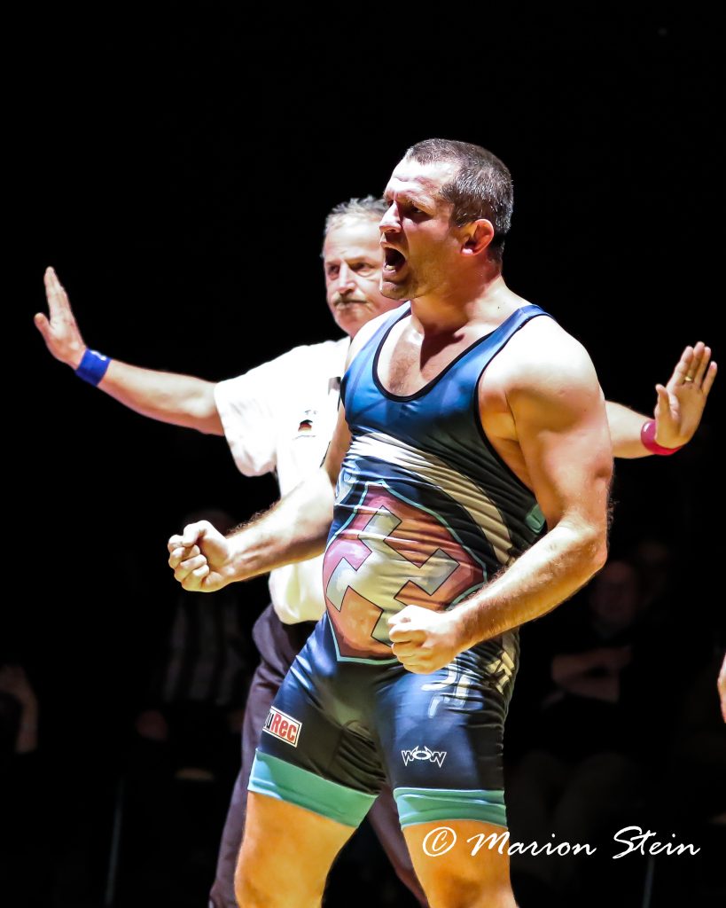 Der Kampfabend begann zunächst wie geplant. In der Gewichtsklasse bis 57kg/GR traf Daniel Layer auf seinen ehemalige Mannschaftskollegen Tim Scheid. Layer dominierte den Kampf von der ersten Kampfsekunde an und punktete mit sehenswerten Würfen aus der Bodenlage zum technisch überhöhten Sieg nach 4 Minuten. Im Schwergewicht kam aufgrund der Ausländerregelung seit langer Zeit wieder einmal Stefan Bonev zum Einsatz. Gegen den knapp 20 Kilo schwereren Frank Gerhard entschied erst ein von Bonev kurz vor Ende der Kampfzeit angesetzter Beinangriff zum 3:2 Punktsieg. Youngster Philipp Kraft (61kg/FR) musste im ungewohnten Freistil gegen Szymon Makuch auf die Matte. Kraft konnte zur Überraschung der mitgereisten Fans den Kampf lange Zeit offen gestalten und musste sich erst in den letzten Kampfminuten dem Freistilspezialisten mit 22:8 Punkten geschlagen geben; ein Erfolg, da Kraft dadurch nur 3 Mannschaftspunkte abgab. Dann der erste Rückschlag für die SVG Ringer. Florian Otto (98kg/GR) bestimmte eigentlich den Kampf gegen Julian Scheuer wurde jedoch mehrfach am Mattenrand von Scheuer gekontert – die 6:2 Punktniederlage war von Trainer Lay nicht eingeplant gewesen. Die dennoch klare Pausenführung von 9:5 Mannschaftspunkten sicherte Sören Stein (66kg/GR) mit seinem 15:0 Überlegenheitssieg gegen Frank Losmann.