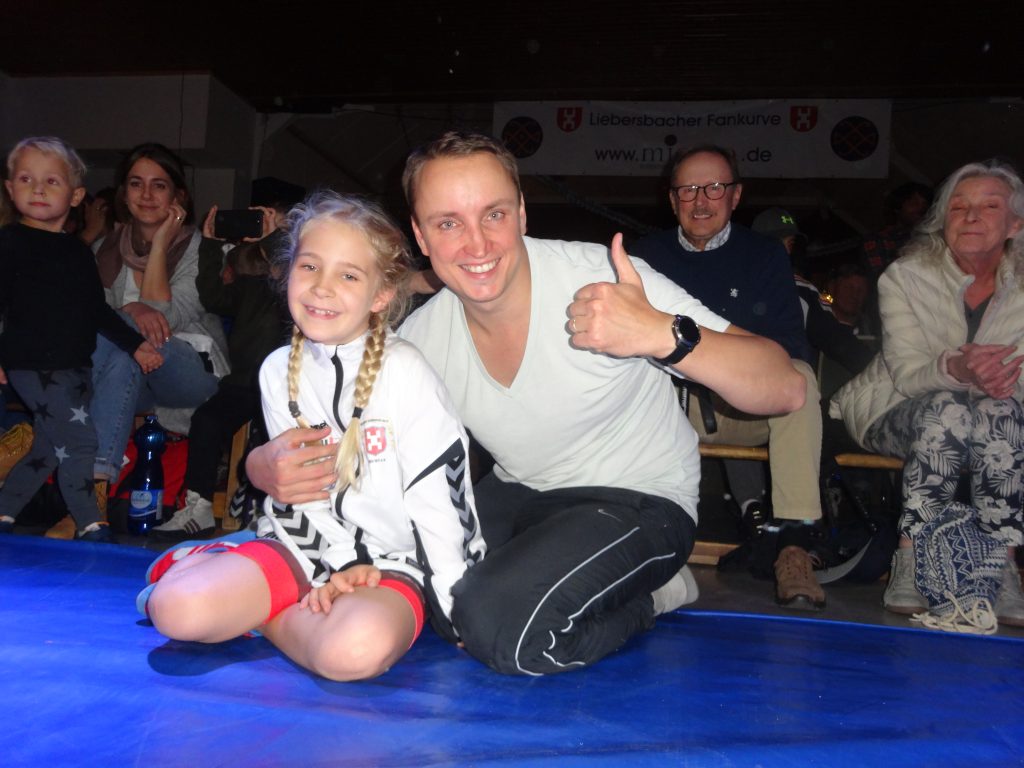 ganz anders verlief dann die zweite Hälfte, in der die Nieder Liebersbach zur Aufholjagd ansetzte. Den Startschuss gab Florian Otto in der Gewichtklasse bis 86kg/GR, der eine bärenstarke Leistung zeigte. Gegen Robert Karkusov, der bereits Medaillen bei Deutschen Meisterschaften gewinnen konnte, hatte er sich einiges vorgenommen. „Heute Morgen beim Frühstück habe ich noch gesagt, dass ich heute taktisch anders ringen will und ihn dann weg ‚ballere‘!“, freute sich Otto über den 6:2 Punktsieg. Diesen schaffte er, in dem er sich Vorteile im Stand erarbeitete und auch im Boden in Punkte ummünzte. Im nächsten Duell bis 71kg/GR standen sich mit Sören Stein auf SVG-Seite und Heinz Marnette zwei alte Bekannte gegenüber. In einem Kampf auf Augenhöhe hatte Stein letztlich knapp mit 2:1 Punkten das bessere Ende für sich. Einem defensiv eingestellten Widersacher sah sich Nicolay Ganchev bis 80kg/F gegenüber. Sandhofens Michael Knittel kämpfte mit harten Bandgagen, konnte sich aber der technischen Klasse nur begrenzt erwehren. Der 9:1 Punktsieg brachte die Mannschaft von Sven Lay bis auf 4 Mannschaftspunkte an die Gäste heran. Als anschließend Liebersbachs Alex Vladut-Stefan in der Gewichtsklasse bis 75kg/F auf Florian Fuchs traf, kochte die Halle. Angefeuert durch kleinere Nicklichkeiten des Gästeringers und das Publikum steigerte sich Vladut-Stefan im Kampfverlauf und erzielte eine souveräne Führung. Leider konnte der Kampf nicht zu Ende geführt werden, weil Fuchs aufgrund einer Verletzung den Kampf aufgeben musste, was der SVG aber die maximale Punktzahl einbrachte. Das Los des letzten Kampfes beim Stand von 14:14 hatte abschließend Steffen Layer. In der Kategorie bis 75kg/GR traf er auf Sascha Knittel, dem er sich mit 10:0 Punkten geschlagen geben musste. „Das war doch wieder ein guter Kampf!“, war Trainer Lay beim anschließenden bayrischen Abend mit der Leistung seiner Mannschaft „sehr zufrieden“. Klaus Andolfatto freute sich über die Resonanz der erstmalig durchgeführten Veranstaltung. Viele Gäste kamen stilecht in bayrischer Tracht und die Dekoration der SVG-Halle sowie die Maßkrüge trugen ihr Übriges dazu bei, dass bis tief in die Nacht fröhlich gefeiert wurde. Musikalisch hatten die Verantwortlichen Manfred Papp gewinnen können, der kurzfristig die „Krankheitsvertretung“ der Talemer Stammtischmusiker übernommen hatte und erst nach vielen Zugaben die Bühne verlassen durfte.